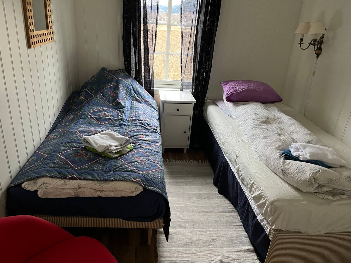 If you’re coming from the south, turn left just before entering the center of Lundamo. After crossing the railway, take the first road on the left. This is a gravel road that runs along the railway for a short distance and leads to the farm, which you’ll see on your right-hand side. The house is the smaller of the two white buildings.