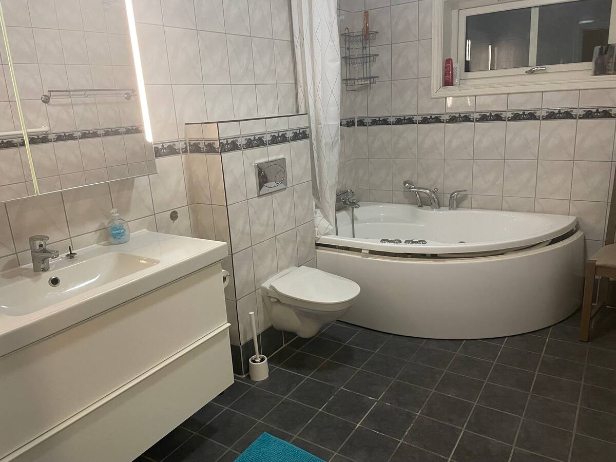 With five bedrooms featuring high-quality beds, a good night’s sleep is guaranteed. The home offers a spacious kitchen, a large dining table and comfortable seating for up to 8 people, as well as a generous veranda, a beautiful garden, and parking. Built to a high standard and located close to Lundamo centre.